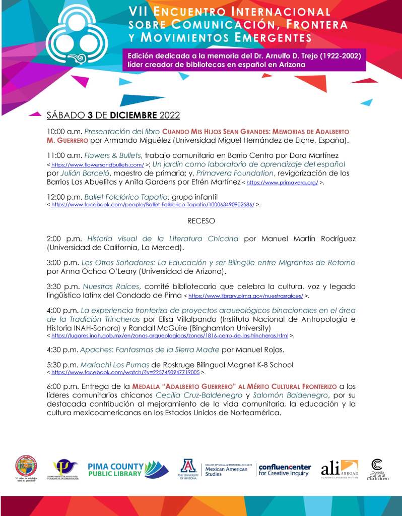 Join Reforma Tucson chapter president, Bob Diaz, for a talk on the life and legacy of Dr. Arnulfo D. Trejo, founder and president of REFORMA National and founder of the Graduate Library Institute for Spanish-speaking Americans (GLISA) at the University of Arizona. This lecture is included as part of VII Encuentro Internacional sobre Comunicación, Frontera y Movimientos Emergentes. This year’s program is dedicated to the memory of Dr. Arnulfo D. Trejo (1922-2002).